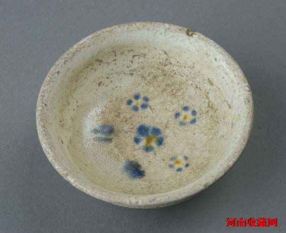 唐三彩碗介绍唐三彩碗唐代(618~907年)口径10.7厘米,底径5厘米,高4.3厘米 2001年8月济源市西街综合楼工地出土轮制而成,敞口,圆唇,弧腹,圈足。内满白釉,内壁底部施六个蓝色花瓣黄色花蕊的团花,外釉不及底。