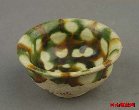 唐三彩杯-2介绍唐三彩杯唐代(618~907年)口径6.4厘米,底径3厘米,高3.8厘米 1991年11月文物管理所移交陶质,轮制而成,侈口,弧腹,近底内收,饼形底,器身施白、褐、绿、黄三彩釉,器外施半釉,内满釉。