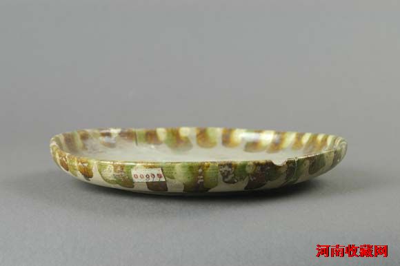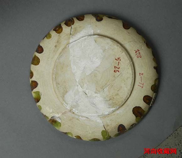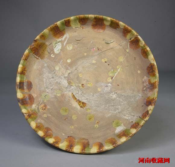 陶质,轮制而成,敞口,圆唇,浅腹,饼形底,内外施黄、白、绿、褐釉。