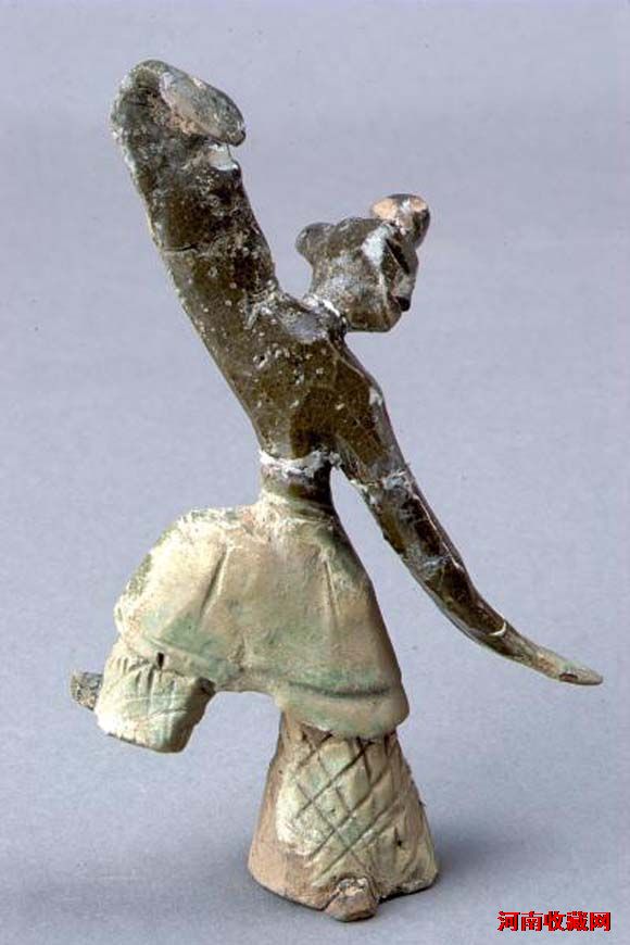 汉复釉陶舞俑-2介绍汉复釉陶舞俑汉代(公元前202~220年)宽10厘米,厚4厘米,高15.5厘米2003年4月20日沁北电厂西窑头M8出土 该褐绿釉陶俑为釉陶质地,整体呈舞状。面部塑造简洁、高双髻。上身着宽袖长衣、下着肥裳。双臂展开,右肢前伸上举而摆广袖于外,左臂下甩长袖于后,头左侧、目光平视。左脚独立,右腿上抬。细腰翘臀。通体施褐绿釉。