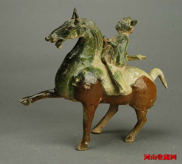 西汉晚期复釉陶骑马俑介绍西汉晚期复釉陶骑马俑西汉(公元前202年~8年)长24厘米,宽7.2厘米,高20.5厘米2003年5月5日沁北电厂西窑头工地M10出土釉陶质地,模制、捏塑而成。俑头戴双角帽,头上扬,身着宽袖上衣,下身着宽腿裤,腰背箭囊,骑于马背上。马昂首,竖耳,双目圆睁,张口作嘶鸣状,脖颈鬃发刻画清晰,右前肢前抬,左前肢着地,两后肢稍曲,尾巴短小上翘,作行进状。上部施绿釉,下部施褐釉。