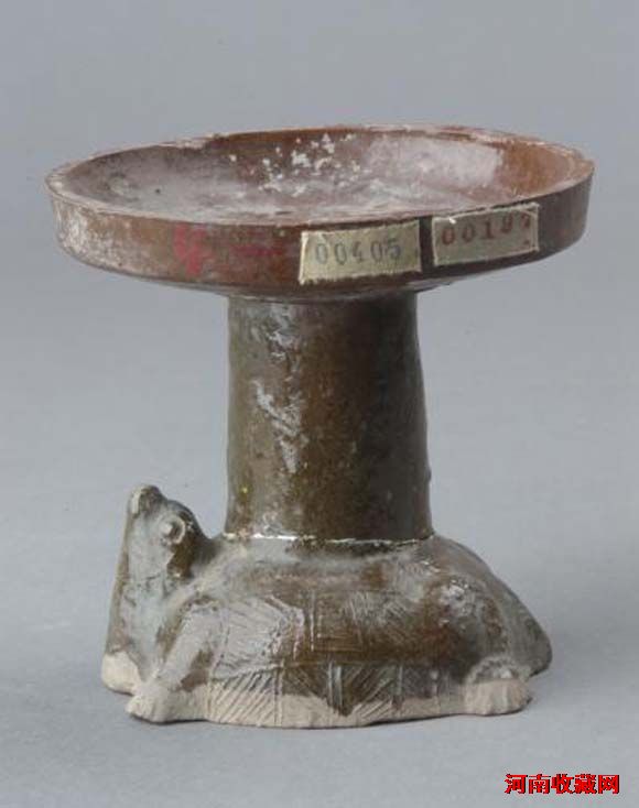 该红釉陶灯浅盘、粗短柄,龟形底座。