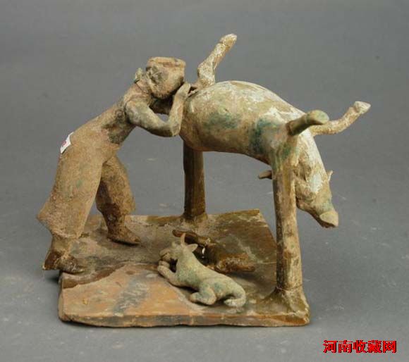 西汉复釉陶宰兽俑介绍西汉复釉陶宰兽俑西汉(公元前202~8年)长16.1厘米,宽16厘米,高15厘米2003年5月5日沁北电厂西窑头工地M10出土釉陶质,模制、捏塑而成。由一人一兽一狗一台架构成了一幅生动的古人宰杀牲畜的场面。一头兽被仰面捆绑在两根柱子上,四肢上伸,腹部浑圆鼓起,头部下垂,口微张。一人头戴平顶帽,上着无袖上衣,下着宽腿裤,双腿叉开站立于台面上,上身前倾,双手置于兽后腿内侧,嘴部紧贴兽皮,往里面吹气。脚旁一只狗悠闲的匍匐于方形台面上,嘴里正在啃咬。满施褐绿釉。