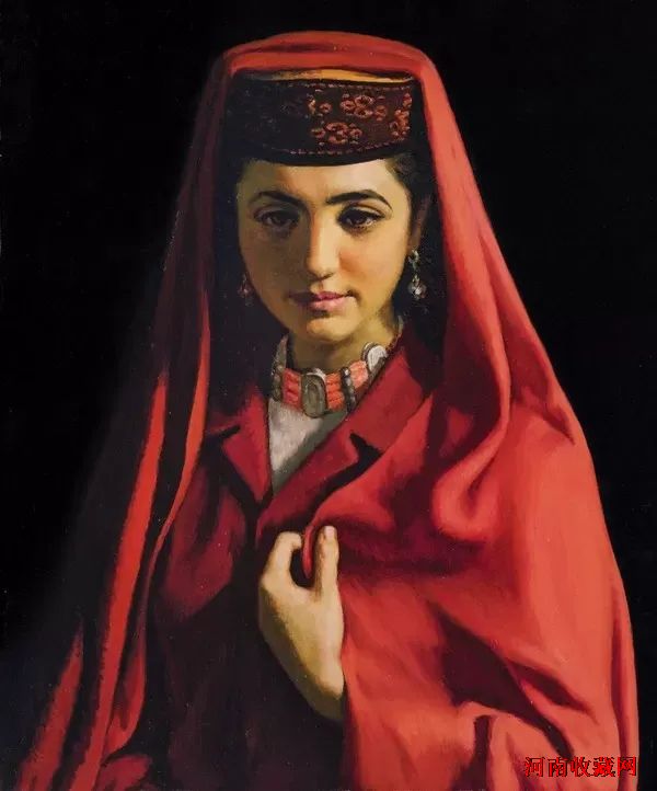 《塔吉克新娘》1983年创作,作者是中国第三代油画家代表者之一靳尚谊。1982年的靳尚谊随着考察团去国外进行艺术考察,在西方各大博物馆观摩,研究了大量的欧洲油画精品,对西方油画语言和特性有了新的理解,对欧洲传统油画中的明暗体系有了更深刻的认知。回国后不久,靳尚谊在国内采风的过程中,在新疆塔什库尔干等塔吉克少数民族地区遇到一对正要结婚的青年,现场用素描稿记录下了新娘的似嫁未嫁,满心欢喜的模样。回到北京后,经过巧妙构思,重新创作而成。