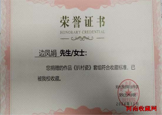 7、2024年10月,边凤娟的作品《扒村瓷》套组被郑州旅游职业学院文化艺术学院收藏。