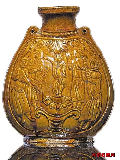“具有西域风情的黄釉扁壶出现在中原地区,正是丝绸之路东西方交流的物证。”3月12日,河南博物院讲解员王思明说,当时,在中原地区,酒器大都是正圆体或方体,而游牧民族所用酒器多为扁体,这种造型更便于携带。值得一提的是,这件黄釉扁壶虽具有浓郁的西域风情,其烧制技术和工艺却是当时中原地区特有的,加之釉色莹润、画面繁简得当、构图疏密有致,具有极高的艺术价值。