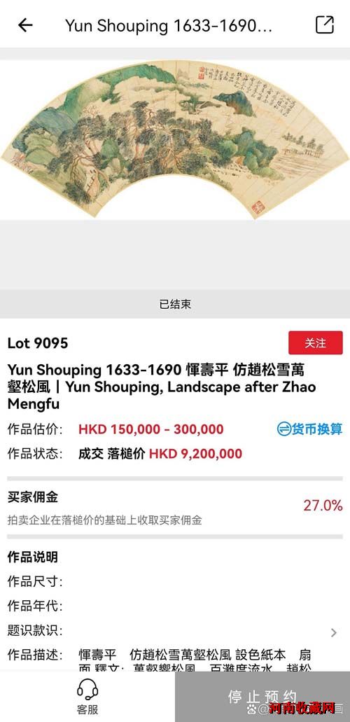 在2024年10月和2025年4月的拍卖中,恽寿平扇面成交价多次突破百万港元。例如: