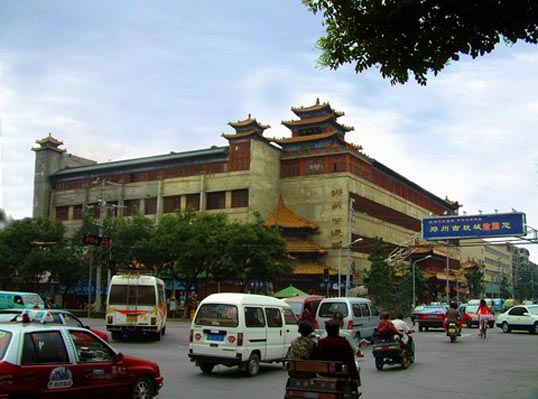 郑州古玩城是要唐代夕阳楼遗址上根据历史文献记载和诗人的意境复原建成的。夕阳楼与黄鹤楼,岳阳楼,烟雨楼一样,同为唐代八大名楼之一,无数文人骚客在这里留下了千情万意和脍炙人口的佳句。当一切湮没在历史的长河中,蒋继明选择了夕阳楼,将一座气势恢弘,古香古色的现代夕阳楼立在了高楼大厦之间,将其变成一座艺术之城。徜徉其中,凝固的历史尽说着民族的繁荣与沧桑。