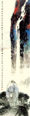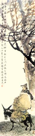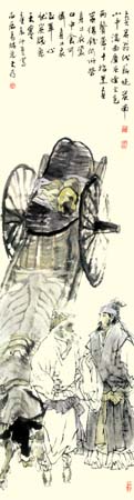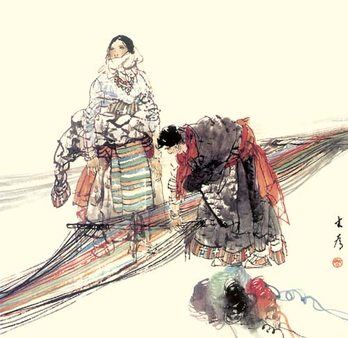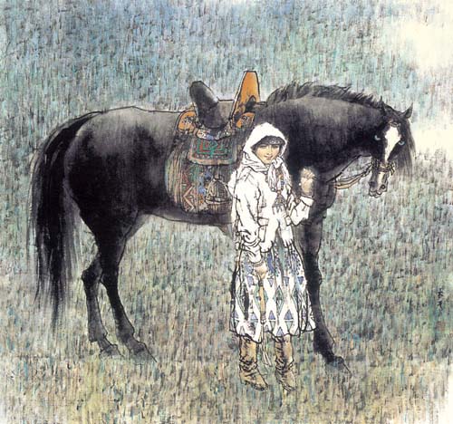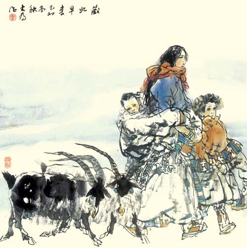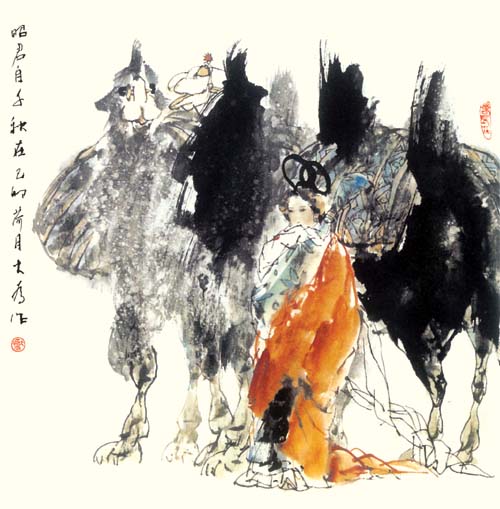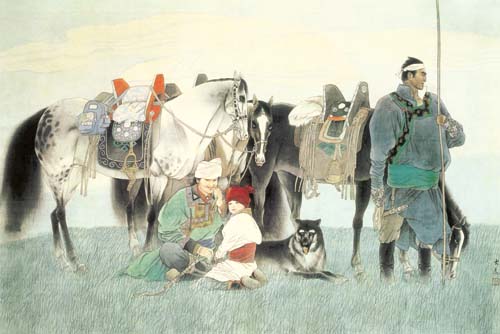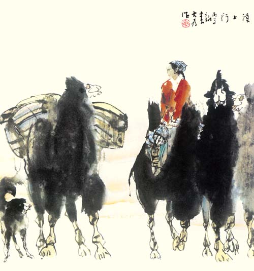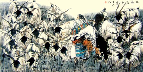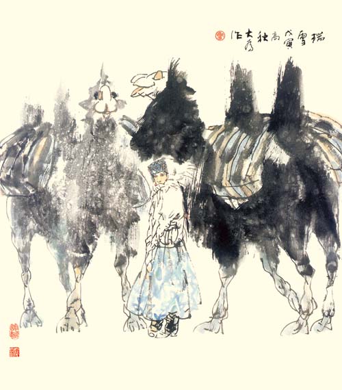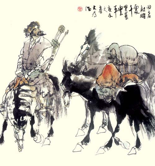 中国人物画在盛唐五代达到高峰,自南宋日见式微。宋明理学占国学地位后,人性、个性更 成了封建文化的绞杀之物。画家为寻求自身安全,多遁迹于山岚水光和花鸟鱼虫之间,人物长期处于“点景”、“比衬”位置。“五四”以来,人物画幡然崛起。开国后,人物画又一度因图解政治而失去应有的魅力。新时期以来,人物画这条近乎枯竭的河道上方百舸争流,大为便是在这激流中博击奋进的一员。大为擅长工笔重彩,传统晕染技巧十分娴熟,水墨造诣也很高,技法把握精到,加上其深厚的素描功底,使他有足够的才华在人物画中径情直遂,风鸣朝阳。如同懂得酒的酵香不是高粱米发酵的气味,大为深谙生活与艺术的真谛。好诗好画不是生活之摹写,乃是人情物理碰撞之花,画者须给人以美,非给人以法,更非玩蛇耍猴者博人之笑。在国画变革有大潮中,大为变法的脚步,如同大漠中的骆印,坚实有力,不歪不斜。他笔下的少数民族人物,造型优美,神情毕肖,意趣高雅。读他的工笔系列《马背上的民族》、如同读一个英雄民族的秘史;读他的工笔巨制《任重道远》,我们从骆驼和旅人身上,均能领略到人生的况味;读他在八尺宣上泼墨《百骆图》,我们仿佛看到了一座座力的山峰……