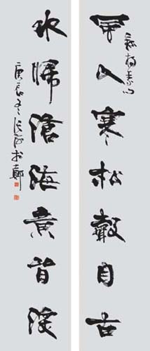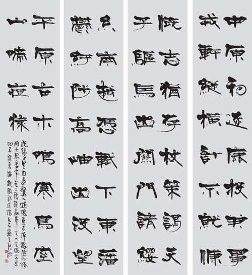 典型的“张海风格”“草隶”当然以“墨海弄潮”展中的《隶书五条屏》(司马迁句)为代表。这是汉隶加汉简的风格。这个风格虽然被称为“草隶”,但我认为应该是其“行书阶段”的作品,汉简的包容性极强,有近于正书者,也就是汉隶;有近于行书者,也就是通常说的汉简;有近于草者,发展而成为章草以及后世的今草,张海先生在汉隶基础上,略加跳掷,自属隶中“行书”。“此种隶书以汉隶为体,以行书为用,用笔随意大胆,取汉简气息却不斤斤于形胲,涵纳百川面鼓荡之,故能兼百味而为一”(《张海隶书两种》)张海先生这一阶段的隶书,既是对正书阶段浸淫碑的总结,也是突破。其“草隶”形态取正势,结字宽博但并不迷恋横势,为他以后的隶书发展奠定了基础。1989年至1991年,张海先生行草书已受到交口称赞,则其行书的起步阶段应该更早一些,只不过早期的行书,而那种略嫌矜持的行草书,也正是张海先生行草书的"成名体制"。行书阶段,张海先生的楷书,也带有行意,不复以规矩为念了。