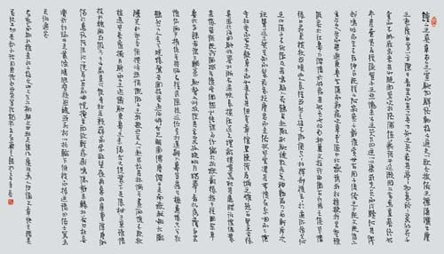 正书阶段,张海先生楷书以《张猛龙碑》为基本面貌。他初从龙门造像入手,刀意历历可按,圭角分明,铺毫行笔,正是典行的笔法。如果与当时相比,自然也不失为能品,但与碑碑相比,则少了些高秀清峻之气,多了些应规入矩。张海先生当时的隶书,已有相当的水平,"以临摹汉碑见长",姿媚之意,如浩风扑面。这在《张海隶书两种》的第一种中,有充分的表现。"此种隶书精美可人,有《曹全碑》的丰腴,有《礼器碑》的峻拨,有也《封龙山颂》的宽博。但这诸多渊源不是杂绘菜的凑合,而是化合物式的融会"(《张海隶书两种》)张海先生既以龙门造像为入门功夫,以常理推断,其隶书应似《张迁碑》以方笔为主,铺毫行笔而有涩意,但其实并非如此,他浸淫汉碑,但不为石刻所囿,这为他迈入行书阶段提供了可能