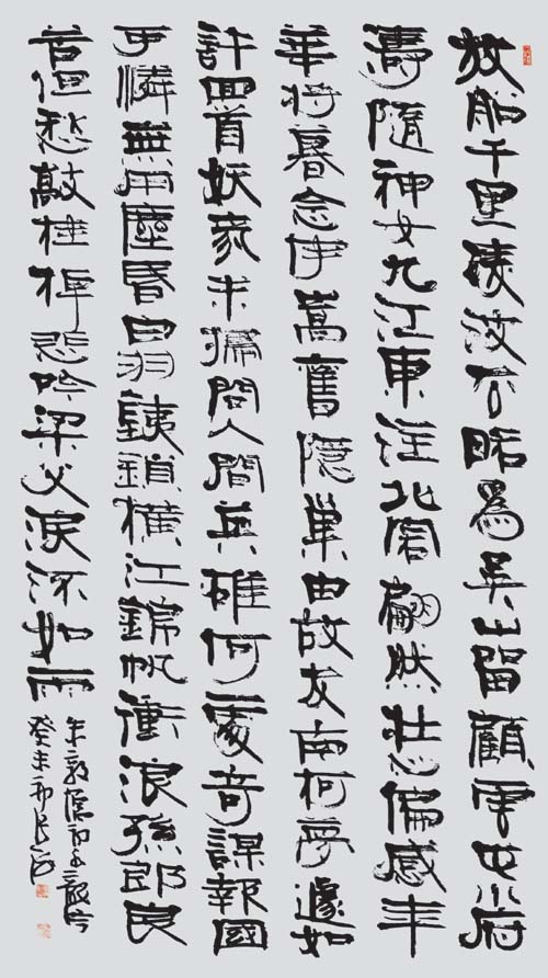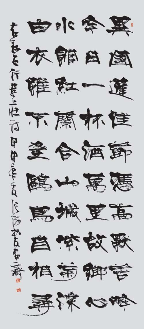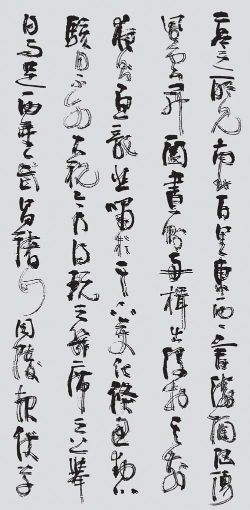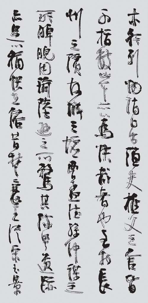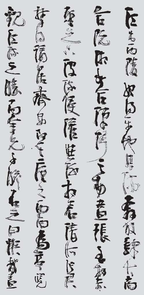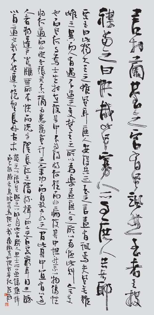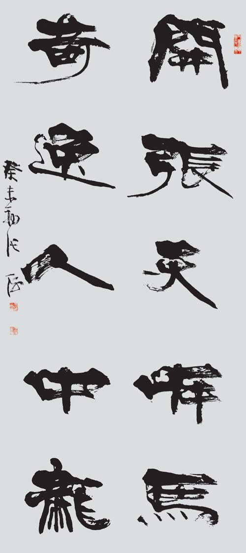 真正的隶中草书是不存在的。隶中之草,也就是简书、帛书中的草写者。在民间书法中,后世的残纸,或多或少有些遗存。而在书法发展史上,则化为章草、令草、狂草。草法是草书的本质内涵,它来于快写的要求,也来于审美的要求,经过符号化,而成为一种相对固定的模式。这种模式不再依赖于正书的写法,所以草书有很大的构成意义。愈是狂草,愈表现为空间的分割。这在张旭、怀素、黄庭坚的草书中,表现得十分明显。所谓“草隶”实际是对隶书的既有程式的突破,而不全是对草书的皈依。这种突破,与草书的精神是一致的,它是对正书宁静氛围的叛逆,而张杨书家的主体精神。隶书草化并不从张海先生始,前辈书家是有所探索的,然而,评心而论张海先生在这方面,可能走得最远。张海先生对自己“张海风格”的突破,也正在于隶书草化的方向上又迈出了一步。之所以说这一阶段是草书阶段,当然是以隶书的进一步草化为着眼点。其实,还有两点心理因素不可不知:其一,在这一时期,张海的行草书,完成了由略嫌矜持向从容洒脱的过度,特别是张海先生的草书,其一“一笔书”虽没有王铎的波澜壮阔,然而漾溢着流丽的旋律;其二,张海先生在长期的文艺工作和艺术实践中,逐步奠定了草书的心理准备。大凡善草者,必有超人的自信,或竟谓之清狂,无此不足以作草。张旭、怀素自不必说,黄庭坚“于无佛处称尊”时,是何等心高气傲;林散之何其寂寞之时,已念念与古人争一座席;毛泽东又是如何问苍天大地,谁主沉浮?张海先生说:“每当我引笔挥洒行草书时,一扫隶书创作时的平静心态,热血沸腾,思绪奔涌,笔随意转,行于当行,止于当止,自觉一任感情的澎湃,笔下自然多姿多态,生气勃发。”此语虽专对行草而言,但也正是其草书化心态的写照。