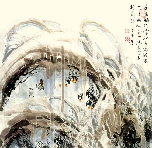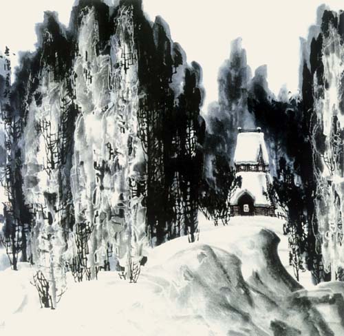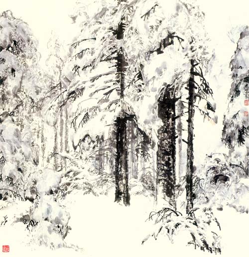 书画家于志学,出生在我国东北,成长于北国,他是雪乡的主人,作为一个冰雪画家,他是得天独厚。但是,这不仅仅是客观条件,还必须具有画家自己的决心与要求。1980年他在“笔记”中写道:“我要在大自然中,陶冶我的思想,锻炼我的技巧,丰富我的幻觉,纯正我的感情。”他的所谓“大自然”,指的当然是冰天雪地的“白银世界”。然而作为艺术家,他有感于客观实际的美,使他有热情去师造化,从生活中汲取自己需要的艺术养料;感到美中有不足,作为艺术家,他才有要求去补足,去创作。黄宾虹曾说过:“天地之间阴阳刚柔,生长万物,均有不齐常待人力补充之。”从艺术的需要而言,画中的山水,应当比现实中的山水更美,于志学就为了这个缘故,要求自己的作品更能打动读者的心弦。他刻苦努力了二十多年,他把时间与精力全部倾注在如何用墨,如何用笔,又如何用水,以至如何更好地置陈布上。在广阔的艺术世界里,于志学这位雪的画家,在亲身的经历中,确感受了冰雪生活的种种启迪。