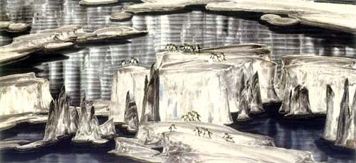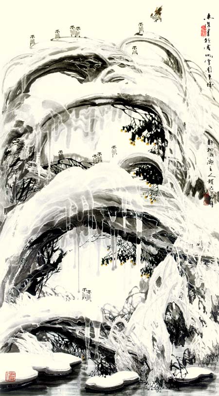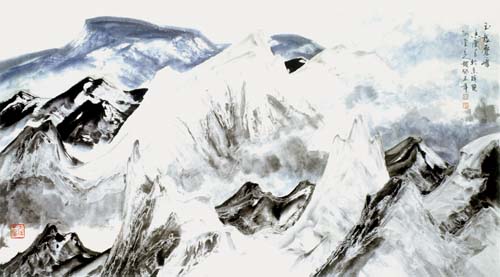 于志学为什么画白山黑水,在这里,他也给我们回答了一些问题。在艺术实践中,这十几年来,他碰到了不少问题,作为一个画家,不能不使他联系到专业上的许多技法问题。有的,可以向“老祖宗”讨教,有的“老祖宗”没有接触到,必须自己去摸索,例如他曾经说:“画往黑处画难,由黑变白更难。以白代黑,黑里藏白,白里透黑,则难之又难。”在近代的山水画家中,黄宾虹的晚年变法,其结果成为“黑宾虹”,使所画“黑密厚重”,其实,他有许多作品,都在于白处用的妙。于志学画冰雪山水,则成为“白志学”,但看他的所画,不少地方的成功在于用墨,所以我说他的冰雪山水为“白银世界三斗墨”。画起来,“黑中藏白”、“白里透黑”,于志学深以为落笔时“难之又难”。一个画家认识到难处,总有一天会突破这个难关,凡事最怕不认识其难。