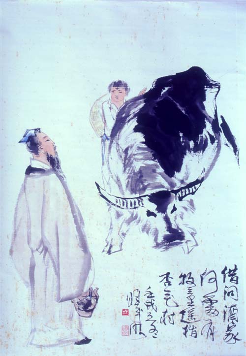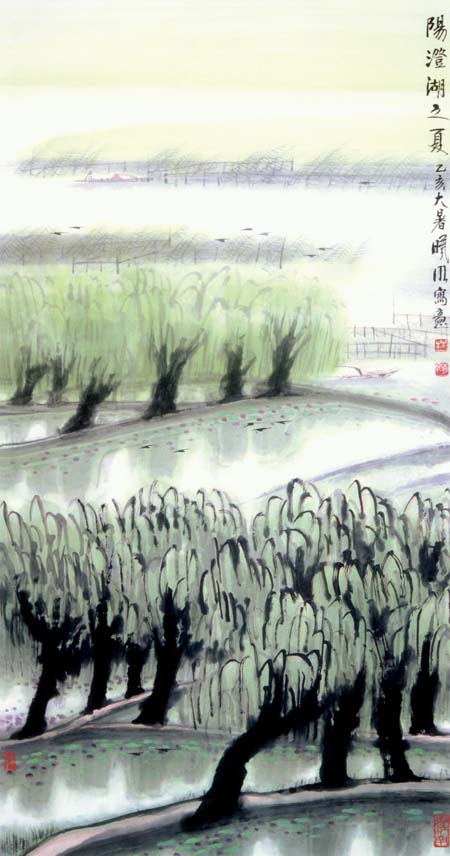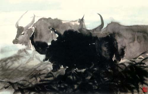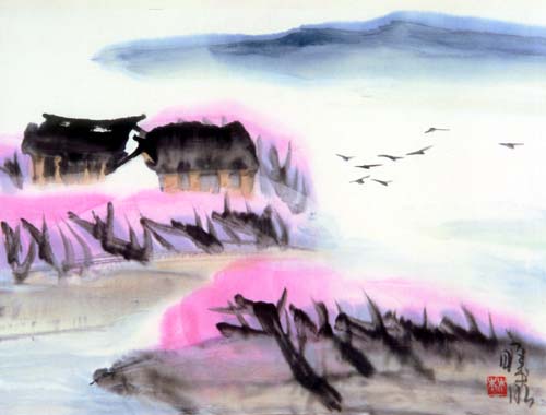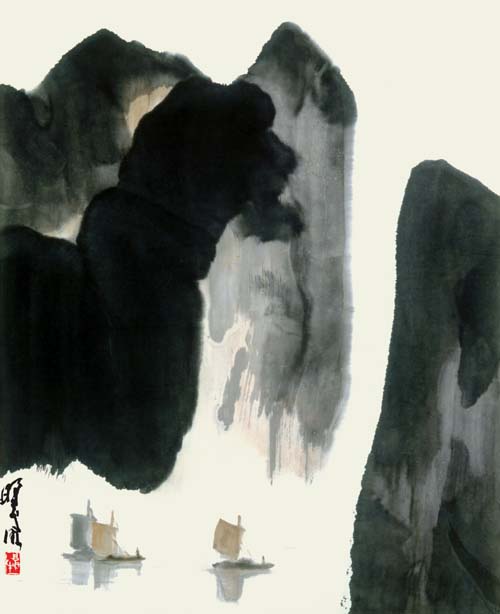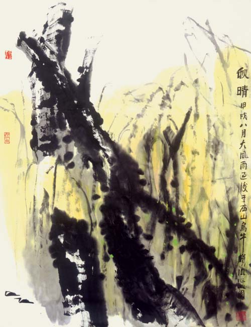 林曦明的写意山水作品标志着艺术的长青,奏出了时代的强音,这和他的艺术处理分不开的。例如无论整体、细节以及整体与细节之间,都十分讲求结构,掌握分寸。在他的画面上,墨与白,有争与无色,线与面,面与块等等,有机的组合起来,而各有自己的价值和意义;又如泼墨、泼彩皆以惜墨、惜彩为基础;再如涂、刷、渍、染并非泛滥成灾,一片模糊,可从笔势、笔踪寻味种种的动向。而且偌多的精美形式都是高速度的落于缣素,最后和审美感情融为一体,心手相应,契合无间,真乃大家手笔。境有清新、淡远、崎峭、幽深,笔可秀雅、奔放、拙拗、刚捷,它们变化多端,而始终是情形兼备,以形传情,尤其是在创新的道路上逐一完成,这更非高明莫辨了。贝尔提出艺术家追求“有意味的形式”,弗莱主张“审美感情乃是一种关于形式美的感情,”朗格宣称“艺术创造了象征感情的形式。”如此等等,其哲学根源有待分折,但都体会到感情与造型生死相依,艺术结构和形式深深影响艺术美的创造。对于他(她)们的论点,林曦明并不排斥,而且予以借鉴。可以说,林先生即掌握形情合一的奥秘,更建立运用新形式的新法则,这就愈加难能可贵了。诚为石涛所论:须法自我立,须了法、化法,并去法障,做到了“法自画生,障自画退”,方为“过关”、“透关”、“斩关”之能手。我们若从林先生的作品中,识别画家之“我”、之“形”、之“法”,以至不役于法,总是完全地理解他,并欣赏他的国画艺术,获得深刻的审美享受啊!最后以一个比干故里的基层宣传部长的身份写一首打油诗结束此文:“锦锈江南孺子牛,辛勤耕耘无所求,八十高龄不停步,笔随时代写春秋,民族精神永弘扬,德艺双馨冠全球”。祝林老艺术常青,多出精品。