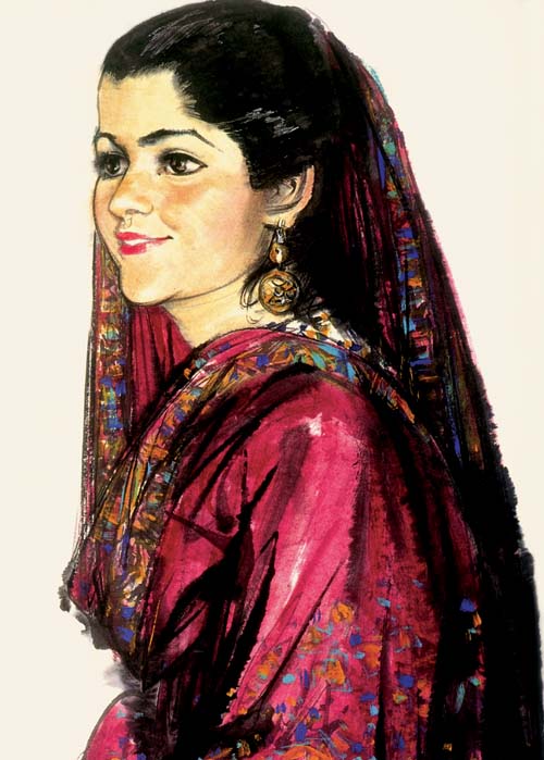 中国画家中的域外题材之作历来不多。当代,在林墉之前,给我们留下比较清晣的印象的,似乎只有石鲁的埃及写生。单是这一点,林墉历访巴基斯坦的大量作品,就有存在的价值。因此为佞未曾涉足巴基斯坦,对那里的风土人情没有任何知识,因此也就无法发表什么更具体的意见,粗浅的观感是,这些作品类似文学作品中的旅游随笔,记录了一时一地的所见所感。或许,正因为作者是“外人”,所以高鼻深目的异域形象,给他留下了更加深刻的印象。另一方面,由于旅途时空频变,也可能使林墉无法像在“寸寸居”斗室所作的人物写生一样,在语言技巧上进行精心细致的打磨。这批域外之作,总体来看,在风格上虽然延续了以前的写实笔法,但纵逸恣肆的线条使其更接近自由流畅的“速写”;可能为了进一步突出语言的概括力,林墉有时也在这种写实风格中糅进一些装饰因素,因此,这批作品也许不能仅仅看做林墉的游巴“实录”,在语言的发展上,虽然不是十分明显,但多少保留了某种探索的意味。而作为风格发展上的一个过程,巴基斯坦之作正好为林墉后来的古今仕女题材绘画提供了美学上的铺垫——后者更进一步发展了线条的速度感、节奏感;任颐灵活生动的笔法,在这里也为他提供了美学上的古典资源。
