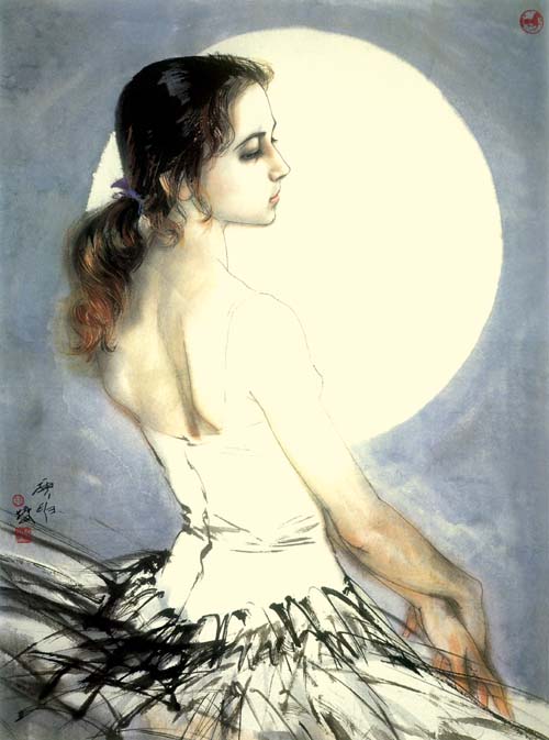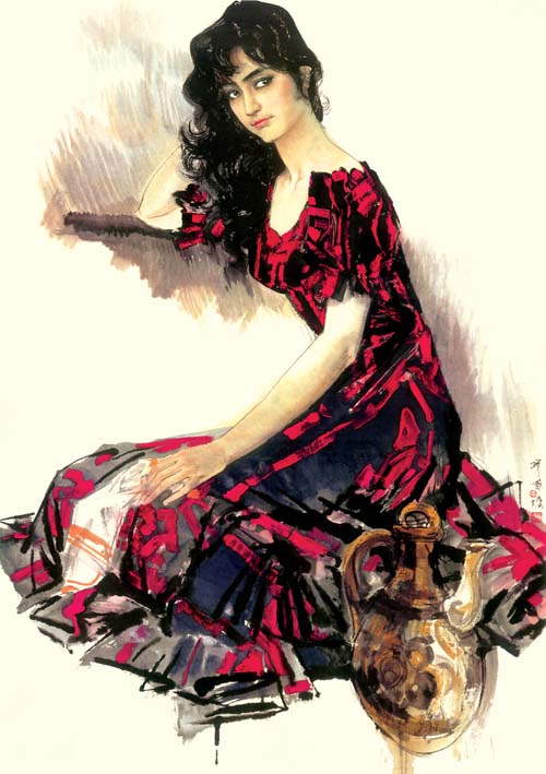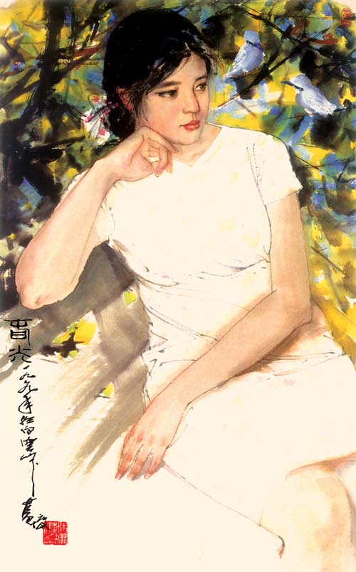我们都看到,与域外之作明显不同,林墉在他的仕女题材作品中不断地追加了色彩的涵盖量。大红大绿、异彩纷呈的色彩和美艳如花的少女既为二,亦是一。在林墉眼中,美人是花,花亦是美人,花鸟抑或人物,不存在明确的界限。于是,《花城》时期凄美的写实主义风格和明确的政治指向隐退了,不断反复强调的美艳的“女色”,既颠覆了泛意识形态化时代神圣不可侵犯的美学原则,也理直气壮地肯定了世俗生活的价值观念。正是这种不避俗艳——大俗而近乎雅的形象,构成了许多读者辨识林墉绘画的标签。由是,林墉也就完成了其绘画语言发展史上另一种唯美主义风格的塑造。林墉此类风格的作品在艺术市场上大受欢迎,以至于赝品层出不穷,正好证明了当代中国世道人心的转变——只要看一看20世纪90年代以来大众媒体推波助澜的消费主义浪潮,也许就不难明白某种根深蒂固的价值理念已经土崩瓦解的底蕴和林墉此类作品“处身立世”的依据。毫无疑问,作为一个曾经无法不信奉“革命现实主义与革命浪漫主义相结合”为最高艺术理想的艺术家,林墉在其艺术生涯中选择的这种明显带有自我嘲讽意味的俗艳倾向,较之后来在某些批评家那里被以奇货可居而精心包装、大肆宣扬的某种团体行为,林墉的选择不仅是孤军奋战,毫无矫揉造作之感,而且起步的时间更早,走得更远,也更耐人寻味——而说到“耐人寻味”,这里也许用得着林语堂在讨论黄州时期苏东坡洒脱自由的生活方式及其醇甜圆熟的诗文风格时所说的话: