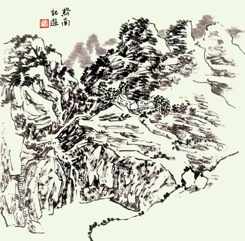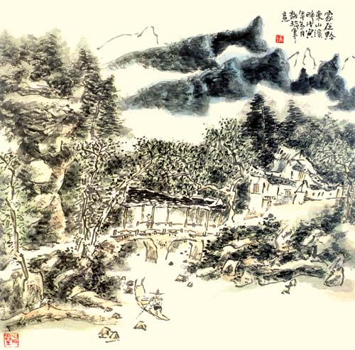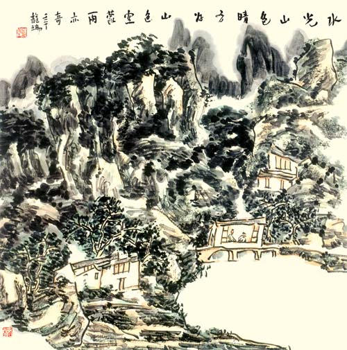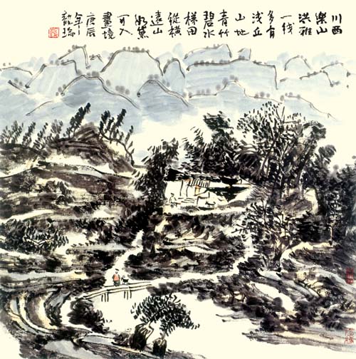 就我个人而言,我对龙瑞那些通景整幅山水作品虽也十分佩服,但却更欣赏他那些得之写生、带有自然气息的小品。如他近期所作的“川西人家”,很出色地描绘了青城山后的景致:山石错布、繁茂的山林掩着几座农舍,山径逶迤而上,行舟泊于山脚之下,山涧溪水缓缓而流,寥寥数笔勾画的远山别有风致。虽然笔调未脱黄家手法,但更多的是应物象形,自然情味溢于画面。再如他的“东山溪畔”,更是一幅写生的杰作。画面左边描绘了坡径和依势而上的山石,石体苔藓重重,四周丛树蔟拥,层次丰富而分明。上端的山峦以花青混墨勾染而成,形拙而有趣灵。画面的主体乃是横跨河溪的石头廊桥,通向右端的人家,行舟从桥下穿过,下端河水留白而成,清澈如镜。这是一幅构图别致、意境幽美的写生作品,其中形象因素的构成以及透发出来的打动人心的魅力完全从自然中获取的。又如他的《川西乐山图》,也是一幅写生妙品,作者题曰,此处“多有浅丘山地,青竹碧水,梯田纵横,远山如黛,可入画境”。的确,作者在创造这幅作品时想到的不是如何摆弄“黄家”画法的技巧,而是主观与客观的融合,笔墨与物象的统一,其构图几乎是从当时眼前景物中直接和盘托出的,丘坡的凹凸起伏,青竹与丛树的生动姿态,黑色的屋瓦与四周的树木在富有变化墨色中显出微妙的层次——这一切被描绘得那样真实、纯朴。远处的青山与浓密的近景形成对比,那轻快的简笔和淡色的花青略施洋溢着欣悦的情调,极富装饰意味。观此图不禁使人恍入自然之境;连绵的山色令人畅神,有一种“万趣融于神思”的审美享受。龙瑞对我说,与西方绘画相比,中国绘画比较重形式而轻内容,与此相关就是中国绘画不太追求“逼真”的视觉效果,而更看重笔墨语言的构造和锤炼。不过在我看来,中国绘画可能在追求自然真实和形式语言构造之间始终保持着一种张力关系——一方面,任何自然真实总是提升到一种有意味形式构造中加以呈现,因而这种形式构造总是保留着一些真实元素;但另一方面,如果这种形式构造仅仅停留在形式层面,从而离自然真实越来越远,就会沦为一种僵化的,缺乏生命力的东西。这个时候就必须回过头来从自然真实中吸取新鲜血液——在此基础上的新的形式构造就与原有的形式规则产生偏离,而这就是风格的创造。从某种意义上讲,一部中国绘画史就是在自然真实的基础上进行形式构造以及加以偏离的风格创造过程。如此来看,龙瑞这批写生作品乃可视为一种新审美指向,即面向自然从而不断从中吸纳新的语言因素、进行有别于古人和前人的形式建构,一种属已的风格样式正在其中酝酿并已经初步展露出来了。而这种吞吐古今艺术精华、参天地化育精神所建立起来的风格样式,将会作为21世纪的一位中年画家在深思熟虑,排除各种干拢之后力求使中国绘画在现辉煌的不同寻常的标志。