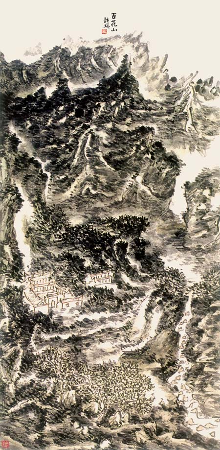 前几日,我院画家周京新和我谈起龙瑞,说他的画气量很大,讲得有道理。套一句红楼梦上的话来讲,就是“英豪阔大宽宏量”、“好一似,霁月光风耀玉堂”。老子曾说:“有容乃大”。龙瑞因为“大”,所以才能包容黄氏山水的整个遗产。而所谓“气量大”,不仅见诸于他的心胸器局,而且也反映在他的思想观念和审美境界上,他的画绝无逼促之感,其理性的控制与热烈情绪的渲泄在微妙的结合和平衡中往往显现出一种超迈的风致。在绘画语言上,能“入乎其内”即“出乎其外”,敏感的心智使他盘桓于黄氏山水之中时时表现出一种游离的倾向。所以我们说,龙瑞的山水画是一个开放的审美体系,在他近期作品中,我们已看到很多的传统画法被吸纳到他的语言构造中,从而大大丰富、充实了原有的艺术语言和格局。例如他的《山水四条屏》,其山脉点苔和远山就采用“米氏”混点之法,留白之处,云气浮动,浓重墨笔之中,但见峰峦枝叶茂茂密密之大端也。他所描绘的《百花山》更是米氏点法淋漓尽致的采用,坚实的山峦造型几乎全是以积点而成,山脉起伏、走向则由积墨留白而显,若隐若现,好似罗丹雕塑中流泻的光的节奏,在画面中形成了一种优美的旋律。整个山川不复是那种圆浑的构造,而是呈尖锐耸立之态,构图于坚实之中聚集着一种险绝之势。笔墨运用似也不同于往常的华滋润湿,而是以紧密的、略带干涩的墨点牢牢地扣住了山脉的筋骨形貌。而他的《门有方袍客图》、《辉县南坪图》用笔率意,粗头乱服,且苍劲邃密,又带有髡残和王原祁晚年的遗风。此外像《开元古塔》、《浮云一扫净》在山形布局和皴法表现上更是多多承袭了董源、董其昌为代表的“南宗”那种通脱潇洒的画风,笔调沉穆而灵动。《浮云一扫净》中某些石块造型和皴法甚至还借鉴了北派的斧劈皴法。凡此种种表明,龙瑞山水画的包容性在承袭黄宾虹的基础上又向整个传统深入进军,尽管他目前尚未跳出黄氏山水的窠臼,但可以确信,在他对传统内在底蕴更深入研习和更深刻的体悟过程将会脱胎换骨,从而走出黄宾虹的笼罩和覆盖。其实龙瑞不仅具有包容性,而且还是一位富于拓展性的画家。我曾见过他在20世纪90年代后期的一批画作,人们只要对比一下他的近期作品即可发现这种提升完全是一种质的飞跃,实在令人瞩目。而且若从他早年学习工艺然后攻取李氏山水,进而又入黄家山水奥堂来看,其间的转换和自我超越表明他乃是一位很有创造潜质的画家,只不过他是那样小心翼翼地守护着一心所认定的传统“文脉”精华,从而有限地使用着创造的才力,以一种虔诚的态度悄悄藏匿在先辈大师背后待机而发。