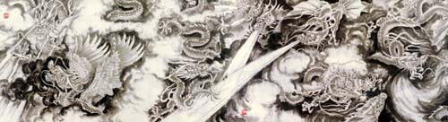 1999年,国庆50周年,绘赠《50条祥龙飞向天门》,同时为党的十五大绘赠了丈二巨幅《中华巨龙》。