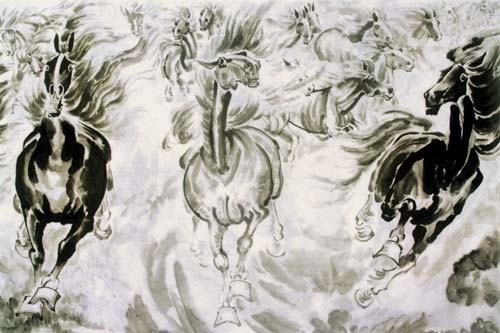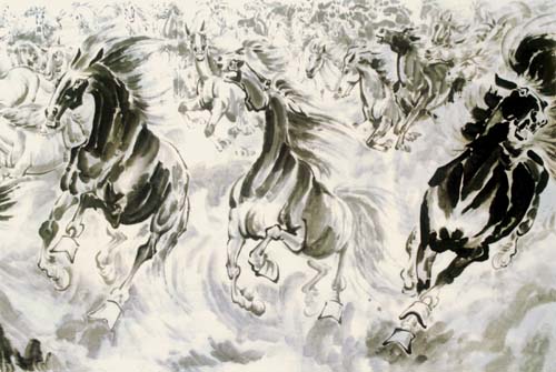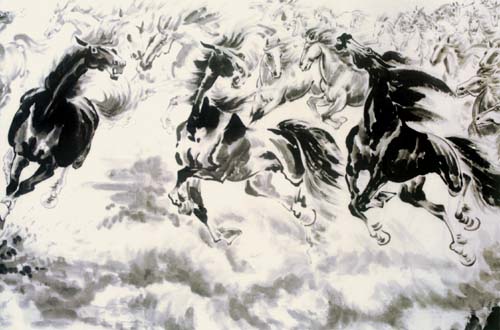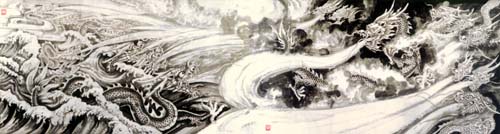 观其作画更是一种高品味的艺术享受。见他将丈二映霜生宣平铺在案,手握斗笔,饱蘸激情,落落大方的泼墨大写和气贯长虹的笔势奔驰纸上,知其白、守其黑,白处似云、似光,墨处似雾似风,风雨雷电造威势,黑墨团中天地宽;再用狼毫长锋,以粗劲的线条勾出龙的轮廓,以浓墨色或重彩染主要部位,达到突出龙的形象,再借助龙的躯干扭曲翻滚,舞爪飘须,巧妙结合,造成气氛,一条条栩栩如生,形态各异的神龙跃然纸上:“或置身风云翻卷之间,或嬉戏狂涛巨浪之中,或须目怒张,利爪奋护,或悠然自得,遨游太空……”但都有凌驾九天的磅礴气势。几年来,像《百龙图》这样的精品力作,连续10部在香港出版问世,成为画坛有口皆碑的高产画家。30年来,他始终笔耕不辍,呈腾飞之象,自信前程远大,亦知艺路多艰,“认真作画,清白作人”是他的座右铭,每天除了作画便是读书,把身心融进了画中,他植根于肥美丰腴的中华沃土,博取于丰富多彩的世界精英,创作出既有鲜明生动的民族风格,又有坦荡轩昂的时代风貌的艺术作品,有胆识、有胸怀地集万龙于一卷,可谓博大中有精神,量之上有升华,繁多中有组织,有统一。他以长江、黄河、长城、天山等祖国名山大川为背景,喻伟大祖国以改革开放的新姿态,以龙的精神立于世界之林,13亿中国人民、56个民族如巨龙腾飞,在党中央的领导下,飞向建设有中国特色的社会主义新纪元的构思独特,立意新警,形成了《万龙图》魅力所在。