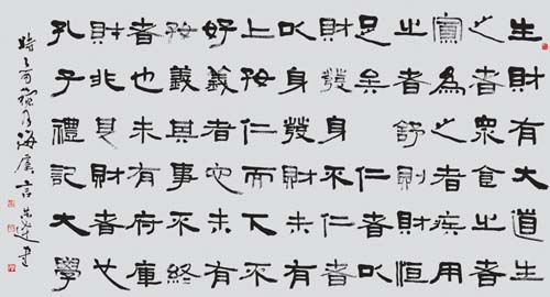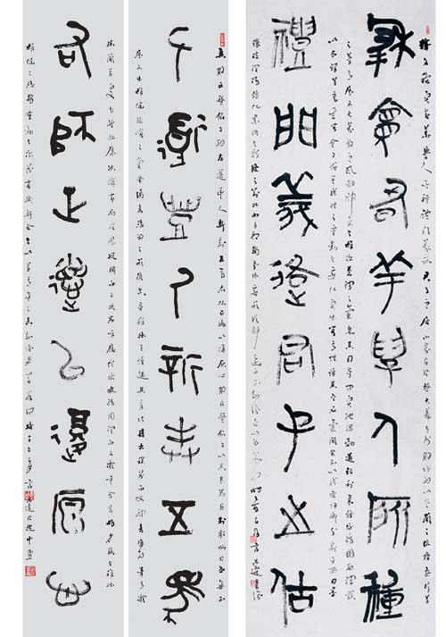从哲学内涵看,是在“中和”精神中践行其人格理想的最高境界的“中和之美”。是以调和、持中为其根本精神。“中和说”的哲学思想在我国的古代早已出现,西周末年它是从阴阳五行说的思想中衍化出的。“中和”思想最早是一种政治思想与道德思想,为缓解和平衡王权至上的思想,取其“适中、不逾、平和、融和”的哲学内涵。《国语·郑语》有曰:“夫和实生物,同则不继。以他平他谓之和,故能丰长而物归之。若以同裨同,尽乃弃矣”。作为艺术中的审美观念,它是政治观念与道德观念的衍化和延展;这就是说事物的相异或相对的和谐统一,才是事物在运动中发展的正常规律。对于一个大书家来说,只有保持身心在一种理性的情感状态时,他才能步入创作上绝对的理想境界;保持一种和谐统一的相对平衡,创作时才能达到人生艺术的绝对自由。关于这点,我们在读恭达的篆书与草书时感受最为深刻;就字的架构,书写时的徐缓,通篇的气韵而言,他都在相对平衡的限度以内求得均衡演进。不偏不倚,没有“过”与“不及”的现象出现;使书写的字,真正达到了书“法”的“中和”的状态。如此观来,他的字“从容中道”,大美内涵。能达到如此的境界,这与他“乐而不淫,哀而不伤”的修养有着直接的内在关联。