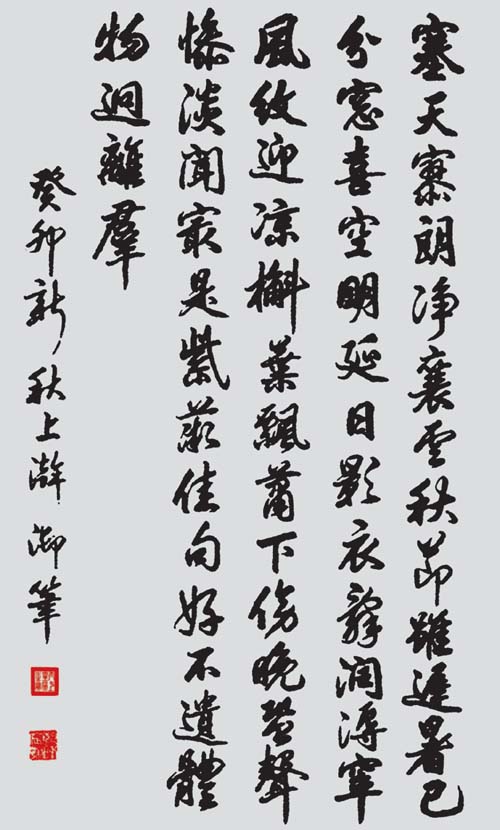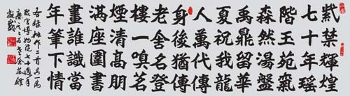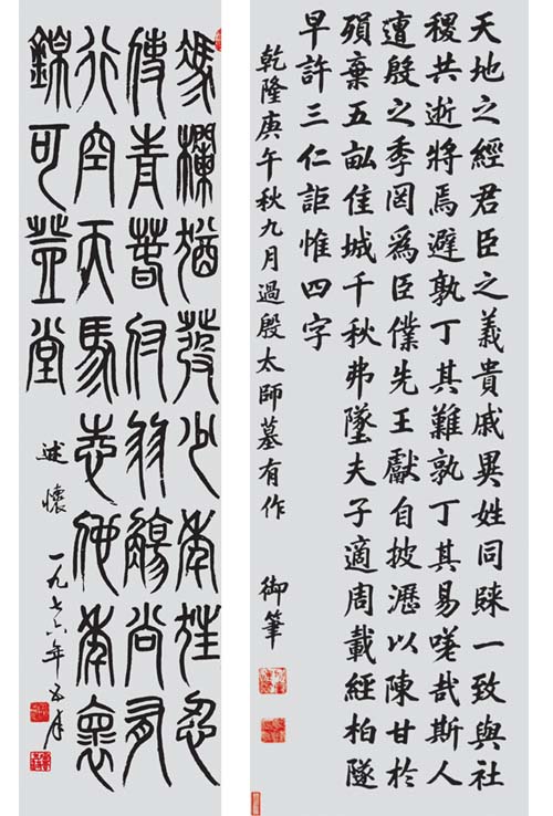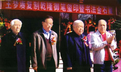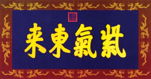 清乾隆帝四次东巡盛京皇宫,御制了大量诗文。有许多文献记载,但大多真迹已不复存在。为救活这批文物,经国家文物局等有关部门批准的提借资料,根据资料查证,对乾隆东巡沈阳故宫时曾陈列于宫殿,屋舍中的匾、联、额、贴落等进行复制。对此事杨老非常关心,几次都很严肃地对我说:“救活文物是我们的历史使命,万不可半点疏忽。”于1978年开始,我复制的乾隆御制诗文和匾额,受到了杨老的表扬,国家文物局对我进行了表彰,国家文物鉴定委员会的同志徐邦达、刘九庵、启功、谢稚柳和杨老都先后接见我,并为我的成功题词祝贺,这对我是一个极大的鼓舞和鞭策。“紫气东来”四个字和“乾隆”“庄妃”圣像的重新再现,引起了社会各界的关注,杨老对我说:“紫气东来”的意义太深远了,我看这四个字是你的代表作了。1992年我荣幸地被国务院批准享受“国务院政府特殊津贴”。1996年我作为赴美代表团团长,参加“清帝王陵墓展”,带去了我所复制的作品,一幅“紫气东来”当即被美国人以80万元买走,并将所有款项全部交给国家。
