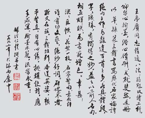 通过与杨老交往我才得知,他不仅仅是一位书法家,还是一位了不起的鉴定家,人称“书画鉴定领域的一代宗师”,他无愧于自己的大名“以德行仁”(《孟子》)“中心物恺”(《庄子·天道》)即以德为本,与物同乐。著名红学大师冯其庸赞道:“杨老不仅是一位鉴定大师,还是一位大学问家、大研究家,同时又是了不起的诗人,书画家。”近半个世纪的交往,我和杨先生学到了大学里学不到的课程,使我在做人、做事、作学问,诸方面受益匪浅。
