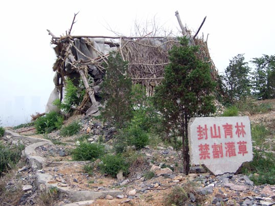 我提了凤凰山绿化六点建议的议案,而且他们很重视,有些都已实施,一再邀请去看看。昨天闲暇,便和报社的朋友驱车前往。的确,凤凰山变了,满眼是绿,且有了水。朋友一再感叹:“上次来,路可不好走,没想到路修得这么快,这么好!”我边开车边想:在山上修路可不容易。 当我看到这个搭在山头已被放弃的简陋茅窝时,我想起了那些为凤凰山绿化而风餐露宿、夏曝冬寒的开拓者,有刘克岭,还有许多我叫不出名字的,他们是英雄,他们千古流芳,我这个山下的本地人感激他们,河南收藏网代表全省人民感谢他们!