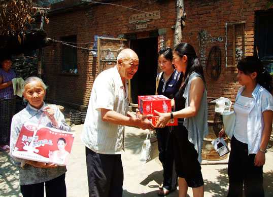 新乡市大唐粗粮王餐饮服务有限公司经理张亚玲(右二),关注昔日的全国劳模梁喜林老人(左二).