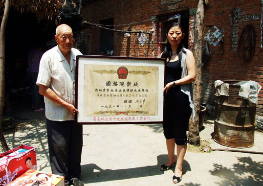手捧1958年周恩来总理颁发的国务院奖状合影