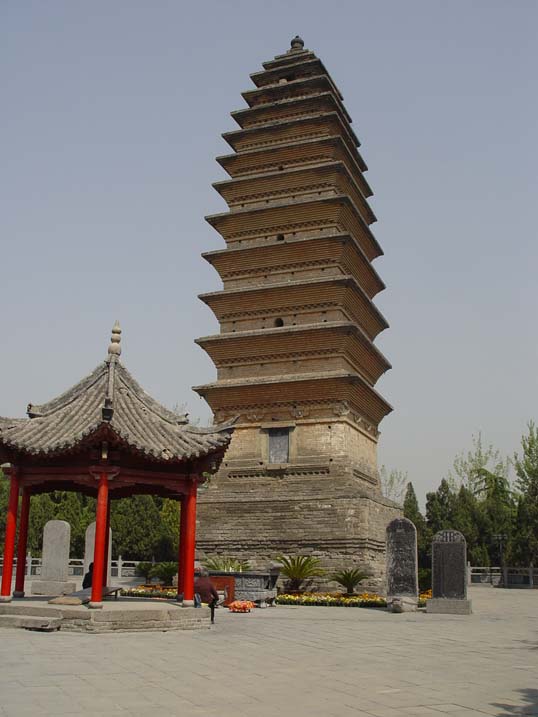 白马寺山门东侧,有一座玲珑古雅、挺拔俊秀的佛塔,这就是有名的齐云塔。齐云塔是一座四方形密檐式砖塔,13层,高35米。它造型别致,在古塔中独具特色,不可多得。齐云塔前身为白马寺的释迦如来舍利塔,现在的齐云塔为金大定十五年(1175)重建,为洛阳现存最早的古建筑。