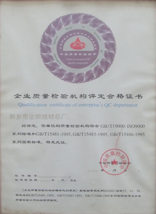 河南省新乡市全顺线材总厂始建于1984年,位于历史悠久、人杰低灵、经济快速发展的河南北部的牧野大地--新乡市。北依独尊的巍巍太行山、南邻祖国的母亲河--黄河。本厂地理位置优越,技术力量雄厚,是一家以生产优质镀锌铁丝、园钉和冷拔丝的专业厂家,辖设十三个分厂,总拥有固定资产4200万元,职工300多人,其中专业技术人员30余人。占地面积10000平方米。该厂采用最新工艺和技术生产的8#-22#镀锌铁丝和各种型号的园钉、冷拔丝产品,质地优良、光滑亮洁、品类齐全、享誉九州,资信等(AAA),年生产能力:冷拔丝30000吨、镀锌丝17000吨、园钉13000吨。产品远销福建、浙江、江苏、湖南、湖北、广东、云南、广西、陕西、新疆等省市自治区。产品质量深受用户好评,在市场上有极好的口碑。先后被中国质量检验协会评定为“质量合格单位”。被中国质量万里行确定为“定点单位”、“无投诉单位”、“先进单位”。被国家质量技术监督局列为“质量信誉跟踪产品”。被国家技术监督局、中国质量检验协会认定列为“产品质量信得过企业”、“国家权威检测达标品牌——国家质量检验连续合格产品”、“质量合格好产品”等多项荣誉。2003年8月通过了ISO9001体系认证,中华人民共和国进出口企业。