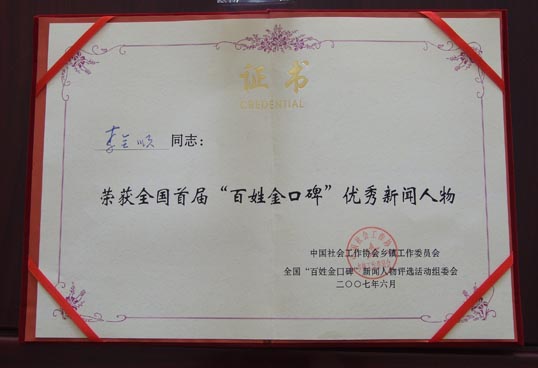 2007年6月 被授予“全国首届百姓金口碑优秀新闻人物”