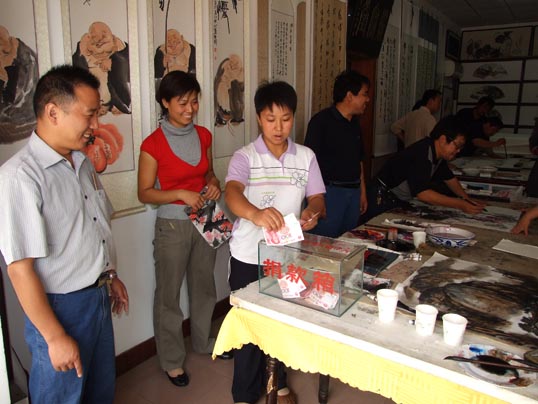 获悉要为卢世明义捐,开封国画院副院长、著名山水画家王一鸣赶来了,河南省政协委员、著名梅花画家张志泉也赶来了,中国书法创作部主任、著名书法家傅中社也派人送来了自己的作品,卫辉市书协主席张斌世、美协主席李甫信及市书协、美协的11位书画家更是笔走龙蛇寄深情,妙手丹青献爱心。
