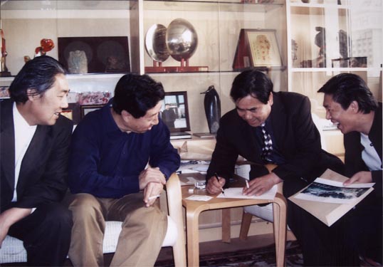 傅世光与中国美术家协会常务副主席刘大为著名画家张志泉、卢世明在切蹉书画技艺。