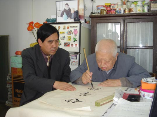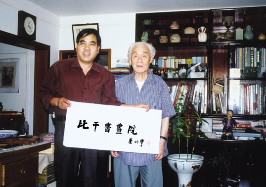 中央文史研究馆馆员、山水画大师秦岭云为比干书画院题词后在家中留影。