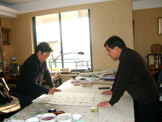 中国工笔画学会副会长喻继高在南京家中为比干书画院现场泼墨