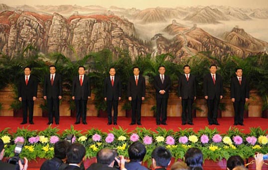 2007年10月22日,中共中央总书记胡锦涛和中央政治局常委吴邦国、温家宝、贾庆林、李长春、习近平、李克强、贺国强、周永康在北京人民大会堂与中外记者见面。