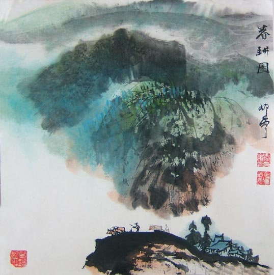 秦岭云斗方山水春耕图 50×50CM