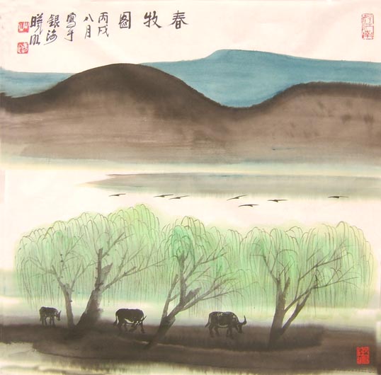 林曦明四尺斗方山水春牧图