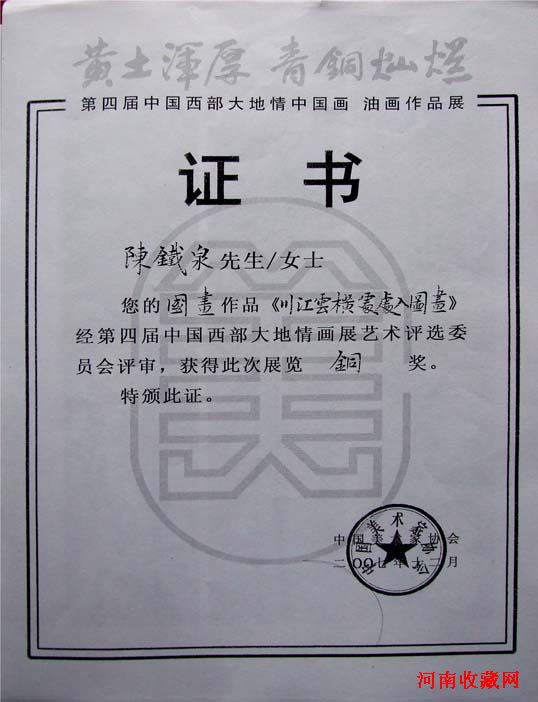 另从有关部门获悉:由中国美协主办的2007年第四届中国西部大地情美术作品展评奖揭晓,陈铁泉创作的焦墨山水《川江云横处处入图画》获得铜奖。