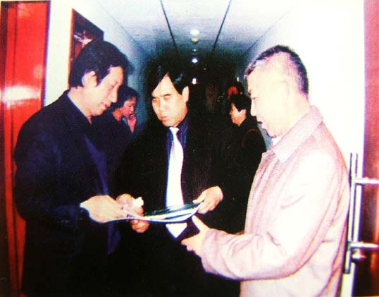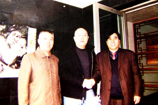 闻大河与中国文联办公厅主任罗阳、北京奥凯立董事长卢甲举在一起