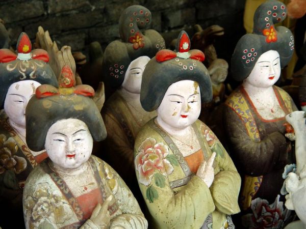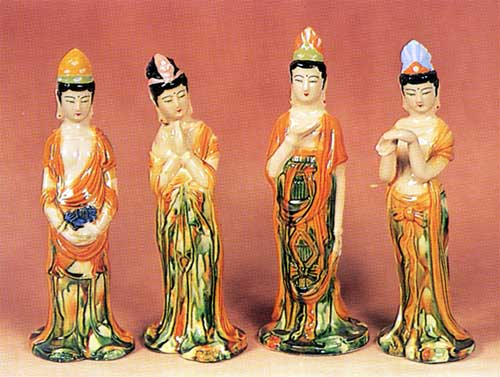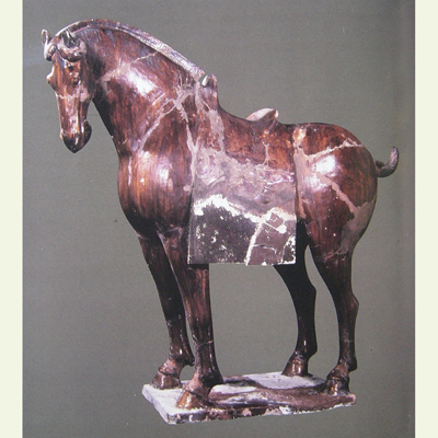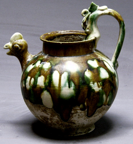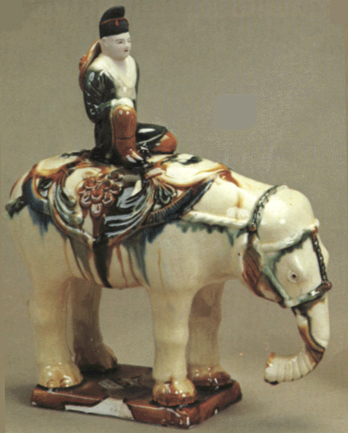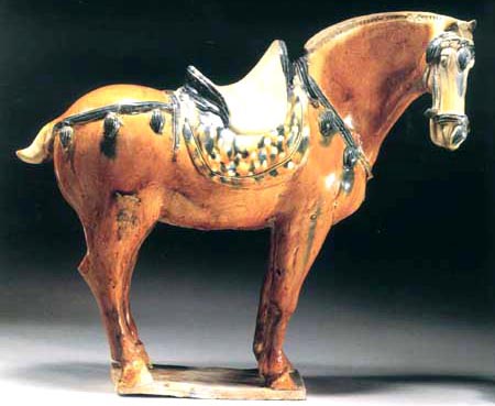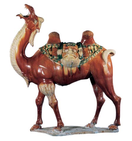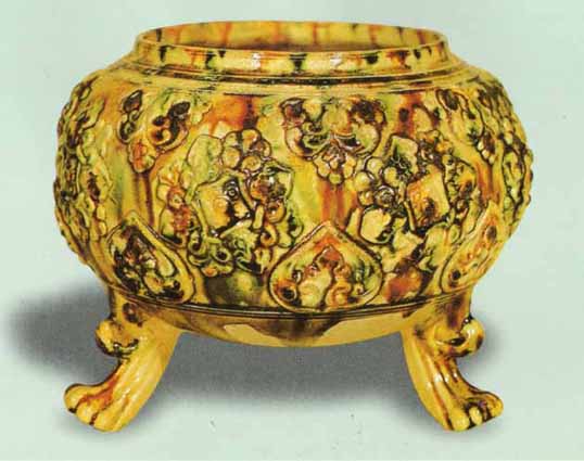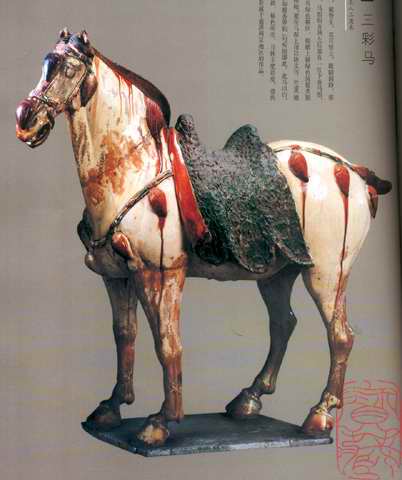 唐三彩是唐代的一种精美陶器。盛唐时代发达的政治经济文化使当时的制陶业十分繁荣,唐三彩陶器是这种制陶工艺繁荣的重要标志。在全世界的许多博物馆、闰术馆及私人藏家手中,保存着许多造型优美、釉色斑斓的唐三彩作品,有立体陶塑,有各种形制的器具。 当我们看到那些奔腾的骏马、被誉为“沙漠之舟”的骆驼、看到那些形态各异的文侍俑、武士俑、仕女俑以及形态各异的动物、禽鸟等唐三彩精品时,会从心底里发出对唐代发达制陶工艺的赞叹。这些栩栩如生的艺术形象,以普通的黏土制成,运用火的艺术使之成为不朽的艺术品,这是唐代无数不知名的陶艺家艺术和智慧的结晶。唐三彩的制作,使中国古代陶瓷发展史翻开了新的一页,它的制作是人类制陶史上的一个闪光点。 什么是唐三彩呢? 唐三彩实际上是唐代彩色釉陶的总称,由于它烧制于唐代,所烧作品用得最多的色彩是黄、绿、白三种颜色,所以得到了唐三彩的名称,实际上,它所用的色彩还包括蓝、赭、紫、黑等。这种彩色釉陶是在汉代低温铅釉陶工艺的基础上,通过长期实践,对含有有色金属元素的各种原料有了新的认识而制作成功的。之间历经了一个由粗到精的缓慢烧造发展过程,到唐供时,终于烧成了著名的唐三彩陶器。 三彩一辞,不见于古代文献,最早的记载是民国时期。而世人对唐三彩的重视大约在本世纪初,1905-1909 年,陇海铁路修筑期间,洛阳北邙山一带因工程而毁损了一批唐代墓葬,发现了为数颇多的唐三彩作品。这批唐三彩被运到了北京市场上,受到了国内外古器物研究者的重视和古玩商的垂青,从此,世人皆知唐三彩之名。建国以来,唐三彩之名长期沿用至今,当然,专业研究者则多以“唐彩色釉陶”之名称呼,从严格意义上说,后者更具科学性,因为从工艺上看,唐三彩是“釉”而算不上“彩”,但唐三彩是约定俗成的名称,有广泛的影响,因而保持这一名称具有普遍意义。 唐三彩在唐代的盛行并予以大量制作有其深刻的历史背景和现实意义。当时的唐朝,政治相对稳定,经济空前繁荣,文化艺术昌盛,国宾的强大促使了各方面的发展。陶瓷业也取得了较大的成就。从另一角度看,唐三彩的出现是社会发展到一定历史阶段的必然产物。经济的发展,也进一步导致了唐代统治阶级生活走向奢侈和豪华。这种追求奢华、讲究排场的生活方式,集中反映于等级森严的典章制度在殉葬三彩狮子唐 品的使用方面,亦即唐三彩陶器方面。在唐代,自上而下形成了一种厚葬之风,上自王室成员,下至士大夫阶级乃平民百姓,都流行以唐三彩陶器陪葬。 唐三彩从唐初开始制作,其间经历了初创走向成熟时期、高峰时期和衰退时期三个历史阶段,这三个阶段与通常划分的唐代三个重要历史时期即初唐、盛唐、晚唐大致相同。公元七世纪初到八世纪即武德年间至武则天执政以前,是唐三彩在唐代漫长烧造过程中的初创时期。其在量制作的多为单一色釉而不是色彩斑斓的三彩陶器,品种较为单一。这个时期的产品以陕西礼泉县唐太宗时代的名将张士贵墓出土的釉陶器和郑仁泰墓出土的彩绘釉陶器为代表。 但这两墓出土的陶器还不能算是典型的唐三彩陶器,当然,这时期唐三彩肯定已经开始烧造了。第二阶段为武则天上台到唐玄宗统治时期,即公元八世纪初到八世纪中叶,这一阶段包括了开元天宝和整个盛唐时代。随着唐朝国力的强盛,唐三彩陶器也随之进入鼎盛时期。因为经济的发展,厚葬之风随之滋漫,无论皇亲国戚、文武大臣还是平民百姓,都有唐三彩陪葬。 现今所见的唐三彩陶器,大量的都出于这一时期,其烧制数量之多,质量之精,代表了唐三彩烧造的最高水平。公元八世纪中叶到十世纪初,“安史之乱”的出现导致了唐王朝政权的动摇,政治经济严重衰退,唐三彩的制作也随之进入了衰退期,典章制度和厚葬之风一去不复返。唐三彩的烧造已成了强弓之末,随着唐政权的减亡,唐三彩也结束了它的历史使命。 三彩贴花炉唐、三彩胡人腾空马唐、“洛阳唐三彩”是今人十分熟悉的一个概念,顾名思义,洛阳是唐三彩的产地,其实,这可能是一个不十分确切的概念,因为洛阳只出土了大量的唐三彩陶器,但至今未找到烧造唐三彩的窑场,倒是离洛阳不远的河南巩县却是唐三彩的故乡。从现有考古资料来看,唐三彩陶器窑场较多的分布于北方地区,主要的要属河南巩县的唐三彩窑场。 唐三彩的品种很多,有器物、有立体塑像、有明器、也有生活用具。从现存的各种唐三彩看,它反映了唐代社会生活最完整的手工艺品,几乎没有一种唐代手工艺品的种类可以超过唐三彩的品种。概括起来,唐三彩大致有以下几种类型: 一.人物塑像(包括人首兽身的镇墓兽) 人物塑像亦即是我们通常所说的俑类,唐三彩的俑也有多种,大型作品如文官俑、武士俑、天王俑,还有人首兽身的镇墓俑或镇墓兽。中小型作品如男立俑、女立俑、骑马男俑、骑马女俑、胡俑、戏弄俑等。文官俑、武士俑、天王俑、及镇墓兽通三彩鸭式杯 唐 三彩骆驼载乐俑唐常出土于身份很高的皇亲国戚和官吏墓中,这些作品一般身材很高,有的七八十厘米,有的可达一百多厘米。 二.动物塑像(包括飞禽走兽) 除各式陶俑外,唐三彩中的动物塑像也是丰富多采的,在各种动物塑像中,马和骆驼最为引人注目。在唐三彩中出现如此之多的马和骆驼,是与当时的社会