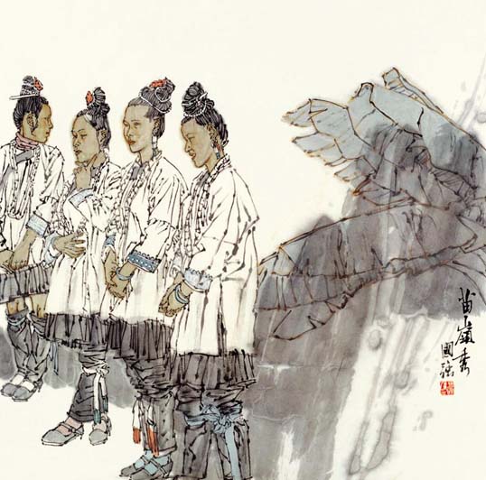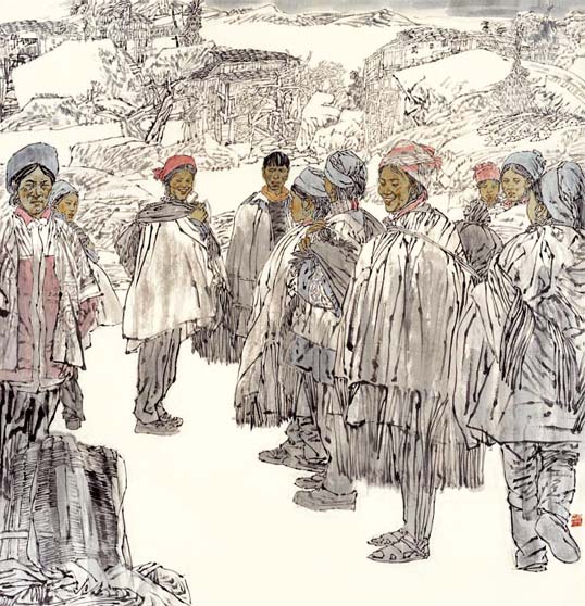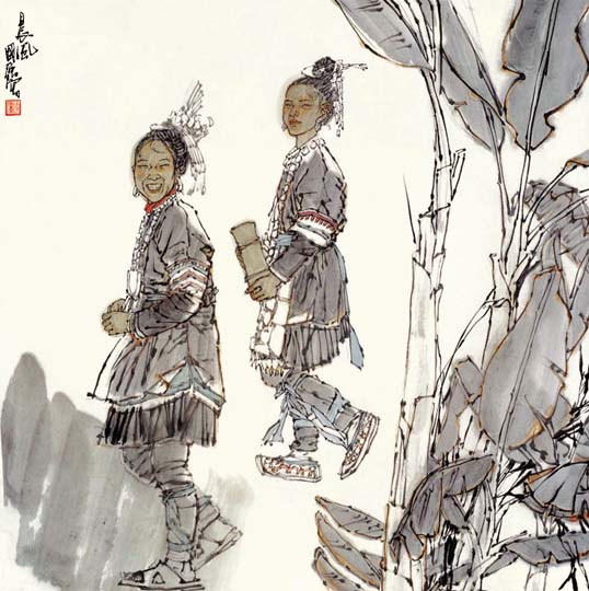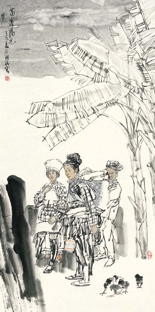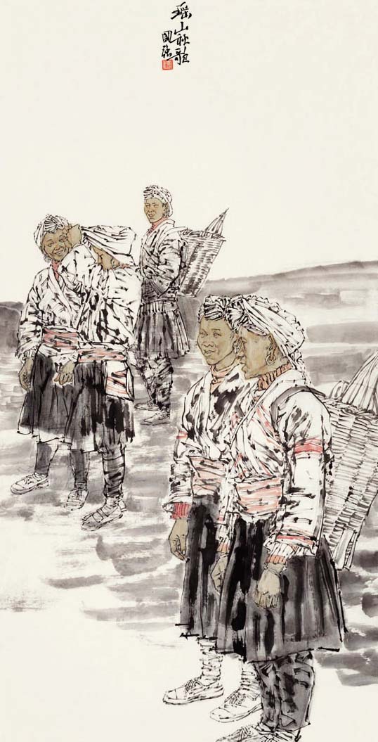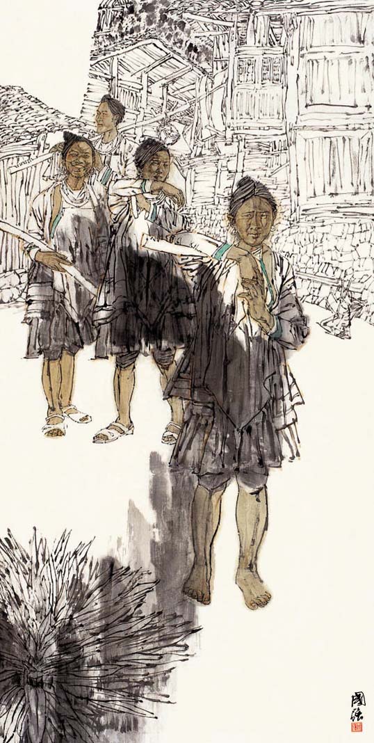 读了国强先生最近一批国画人物新作,这些从现实生活原汗原味中幻化出的活灵活现的笔墨精灵,让人倍感亲切。仿佛是乡亲,是朋友,是至爱,总觉得有话想对他们说,可又觉得他们远在滚滚红尘之外。展现在我们眼前的是高于生活的、一派诗化的生命形态,但见其阳光融融,诗意融融;其形象之生动,笔墨之洗练,设色之典雅,审美把握之清纯与新颖,给人留下了深深印象。像《高原之秋》、《阳光融融》、《侗寨春色》、《布依山寨春早》、《惠安海边》等一批新作,都让人没然神动,流连再三。