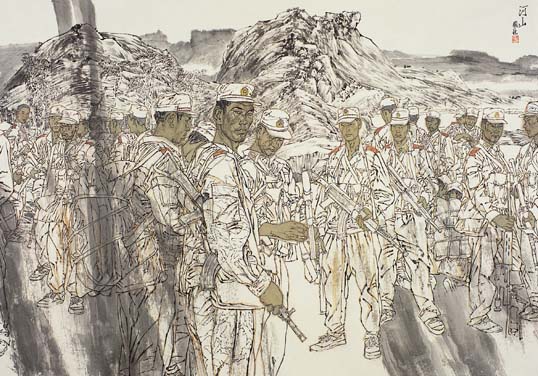 国强先生近三十年夙兴夜寐无一日之懈,笔下走出的人物早已成百上千。按说,形的问题,对他来说应该是不成问题的问题了,而他却异常清醒地认识到,形的把握是人物画创作在形象的塑造中至关重要的一环节,给以高度的重视;即使是意象造型,也不应是形的放任、形的流失,而只能是形的醇化,形的升华。国强的人物画创作能有今天这样的成就,在形的把握上能够得心应手,完全得益于他坚持不懈的速写。欧阳公之为文多在三上:马上、枕上、厕上。国强画速写是见缝插针,那怕十分八分钟,不管人还是照片逮住就画,不几天就是一大本。有朋友说:“老画家了;背着倒着都能画,何必如此手痒?”他却笑道:“妙手尚且‘三日不弹,手生荆棘’,何况这等凡夫俗子。”他深知,形象如果失去了生活的滋养,必将变得黯淡无光。一些过去曾经创造过辉煌的巨擘大家,由于形的放任流失或者形的结壳自缚而使自己的作品永远失去了昔日的光彩。笔墨也好,章法也好,一切的一切都必须为塑造形象服务。否则“皮之不存,毛将焉附”?可以段言,那些沉溺于笔墨而丢失形象的人物画家,不可能有太大的出息。