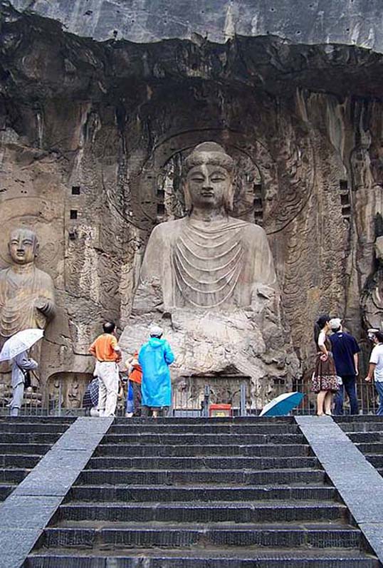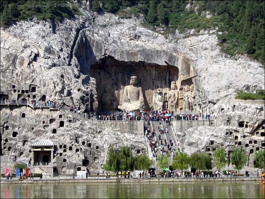 它位于洛阳市南13公里的伊河两岸,这里两山对峙,伊水中流,形若门阙,故称“伊阙”,隋朝始称龙门。龙门石窟自北魏孝文帝迁都洛阳始凿(公元493年),历经400余年的雕刻,现存窟龛2300多个,雕像10万余尊,碑刻题记30多万字。两山窟龛造像以数量之多,规模之大,题材多样,雕刻精美,蕴涵丰富而蜚声中外。以北魏和唐代造像达到当时艺术的顶峰及匠心独具的皇家典范、中原风格而异于早、晚期石窟。以碑刻题记数量为世界石窟之最而被誉为“古碑林”。以造像内容广涉佛教信仰的众多宗派甚至包括道教的题材也是石窟艺术中所罕见。龙门石窟以大量的实物形象和文字资料从不同侧面反映了中国古代政治、经济、宗教、文化等许多领域的发展变化,对中国石窟艺术的创新与发展做出了重大贡献。