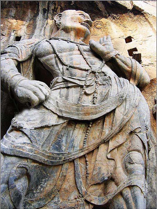 龙门石窟是北魏、唐代皇家贵族发愿造像最集中的地方,是皇家意志和行为的体现,具有典型的皇家风范。其中奉先寺规模最大,是唐代雕刻艺术中最具代表性的作品。皇后武则天曾助脂粉钱两万贯,于上元二年(公元675年)竣工。它是依据《华严经》雕凿的敞开式佛龛,主佛卢舍那大佛,通高17.14米,头高4米,耳长1.9米,她雍容大度、气宇非凡、撼人心魄,体现了大唐帝国强大的物质力量和精神力量,显示了唐代雕塑艺术的最高成就。