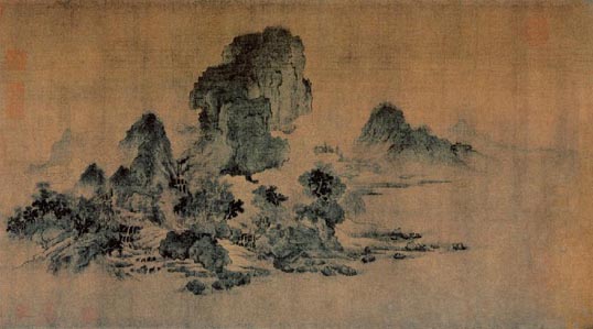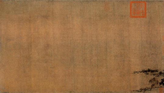 王诜(1048-1104),字晋卿,山西太原人,居开封。官至宣州观察史,娶英宗赵日署女魏国公主。官左卫将军,驸马都尉。王晋卿所画烟江叠嶂图,传世不止一本,画法略用青绿设色,石皴在不方不圆之间,小树多夹叶,别具一种风格,同专学李成、郭熙画派的不同。此画面萧疏清远,表现了烟雾迷蒙的水乡景色,在构图上,远近疏离,似有一透视感,远山隐映于云雾之中,悠远秀丽。本幅无款印,有宋徽宗赵佶标题:“内府所藏王诜四卷中此为第一”。