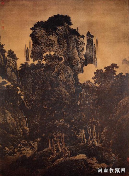 李唐(1066年—1150年),字曦古,中国南宋画家,河阳三城(今河南孟县)人。李唐原供奉宋徽宗的画院,精於山水画和人物画,1127年金兵攻陷汴京,李唐颠沛流离,逃往临安(今杭州),以卖画度日。南宋恢复画院後,李唐经人举荐,进入画院,授成忠郎职务。李唐的山水画最初多画北方气势雄浑的山河,以雄健的斧劈皴描绘青绿山水,如《万壑松风图》、《长夏江寺图》等,是北派山水的著名代表人之一,其後用笔及取景变的简括凝炼,构图精练,意境优美,开辟了南宋的新画风,并创作了人物画《胡笳十八拍》、《采薇图》等,借历史抒写怀念故国,希图中兴的感情。李唐的画风对後世有很大影响,他也培养了一些弟子,其後马远、夏圭继承和发展了他的画风,和他一起,并称为南宋四家(李唐、刘松年、马远、夏圭)。 《万壑松风图》作于北宋宣和甲辰(1124),当时李唐五十八岁左右。此图山石巉岩,峰崖峻险,从山麓至山颠,长松葱翠,迤丽万重,山腰间白云缭绕,岚气若动若静,远处飞瀑两挂,珠垂一脉,喷云而下,近处乱石跳珠,水流奔腾,画水全用线条,力沉气猛,极见功夫。全图章法采顶天立地式,显得雄浑森严,气壮山河,而奔流夺路,飞崖喷壑,频添不少生动之趣,山石皴法,高度融会了李成、范宽、郭熙诸家技巧,为了画出由中到下端,石体倒悬的层层凹凸,以及石皮的斑剥风化,李唐主要使用他首创的马牙皴,从而显出整座主峰端庄伟岸,巍然傲踞的雄姿,此外在图中似可窥见李唐后来创造出小斧劈,大斧劈的雏型和萌芽。 这件不朽的著名作品是南宋画家李唐一生中最杰出的巨迹, 也是李氏自立面目开宗创派的奠基之作, 所谓“皇皇巨迹, 后近之准”,决非后来者虚誉之谈论也。 斯图妙作用三拼绢画成, 纵有一百八十八点七厘米,横有一百三十九点八厘米。设色浅绛, 款识隶书于远峰尖耸之中。 浅墨落笔, 题为“皇末宣和甲辰春河阳李唐笔”,宣和甲辰即公元一一二四年。 如果说李唐在宋建炎年间已“年近八旬”的话, 那么这帧《万壑松风图》则可能是李氏七十岁左右时期的作品, 可当视为南渡以前的晚期作品,此图经宋内府,贾似道, 明内府及梁清标等递藏, 在《石渠宝芨》三编里有著录, 收藏印有“乾卦”(半印),“悦生”(瓢印),“司印”(半印), 梁清标收藏印三方, 清嘉庆诸玺等, 是轴名迹现藏于台湾省故宫博物院,我有幸于二○○一年八月间访问台北并应邀对该院庋藏的历代名作近四十余帧进行了浏览和认真的研究。读来细察, 每件作品的风格与笔路痕迹均有自家面目, 可谓 “千姿妍丽, 睹之快哉,终生益也。” 山水、 花鸟、 人物凡数十卷, 其内容之丰富时至今日也无法用笔墨描诉以陈世人。展卷所思, 各卷墨迹尽能气息渊深, 笔法清健, 高迈超逸之图悦目而动心, 时在激动之中而又多留记忆里复读参悟, 作品犹如中天日月, 星光灿烂之光华耀千古而不败灭,倍感品古贤艺道之深矣。 然察个家绢本知其画境笔法确出于“外师造化, 中得心源”这一伟大真理。 卷中人物有神情古貌俊逸者;有朗月疏怀、 篱下弄菊、 踏雪寻梅者;有文雅风度、顾盼相视、 杖履山林者;有指点江山一笑中, 有漫步遗兴游山乐水者;更有衡山诸老之遗韵, 令人心驰神往。 花鸟工虫、 雅趣横生, 神形兼备,格体殊异,品读之中如获和氏壁玉,供为国珍。 山水诸图笔健气雄, 峰峦巍峨, 胜境壮观, 江涌澎湃, 或听潮音, 或看流云千里、 日升东山, 或暮霞如血、 万籁寂静, 绢素之本流露出作者无限情怀,挥毫泼墨、 奏起天地间华美乐章, 尽得造化之大美也。 诸多作品, 余独以对李氏《万壑松风图》一轴读来用力最深。此帧构图端庄雄伟, 用笔森严, 笔趣新异, 上能承传古贤诸家之法, 下开南宋四家之首本。 近景作崖谷深幽之貌, 危岩嵯峨磊落雄壮之美,峰峦郁盘之气得于画家胸藏蕴藉深邃之意境。 造化与心源相融, 万壑松风随笔而迹化, 山麓及顶,笔法多变, 开历代画迹之新貌。 松树浓密苍翠,山腰白云缭绕, 游浮缥缈, 可谓“一图之中, 动静有序,疏密法备, 尽得自然之姿, 承其妙理而得造化之功深矣”。 图中风雅韵至, 石坚如屈铁, 溪水甘甜可饮,树干挺拔参差多生异趣,妙姿无穷,苍古秀妍,全无僵板之形而生动自然生机藏于质内, 激情发于毫端, 精气神彩犹多盛矣。 参天倚石而立,松风似细语与幽泉溪水相奏, 成天籁之音鸣于九霄悦耳不绝, 传数十里而不断焉。 瀑布高挂,一泻涌千层银花, 似雪激荡奔跃迂回于乱石松荫之间。 苔新弥滑, 天际清爽,其格犹在于作者图画妙写景物造境之生动, 深得诗情画意之三昧。 使赏者悟而通达, 漫步其中, 享有不尽自然之趣味与喜悦之情怀耳。 故李氏笔墨, 浑穆严谨,一图远峰之景, 峭壁峰峦之绝, 孤标峙耸,紧贴主峰。 若即若离,布阵巧思而又极具稳妥, 山峰之势欲刺破青天。 一轴华卷, 石格皴法, 奇伟壮观, 融合诸家之法又能统一完整, 笔迹粗细相参,夹杂偏锋。 画石墨染次数较少, 多以皴勾一次完成, 前景岩石水流行笔有力, 松下皴面用笔劲峭, 以小斫笔长短皴刮铁皴与润笔豆瓣皴为主, 细部以短线浓墨层层渍之。 石分四面, 石体斑纹结构尽能表现石骨风化之迹象,自创诸多皴法, 下端石体层层凹凸, 质感极佳, 秃笔之法, 笔笔峭硬, 短线之笔不难看出源于范中立而变化自创新体, 称之点斫勾砍。 皴擦渲染相合, 有马牙, 雨点, 豆瓣, 小斧劈等, 干浓皴操,画面用墨浓黑深沉, 有